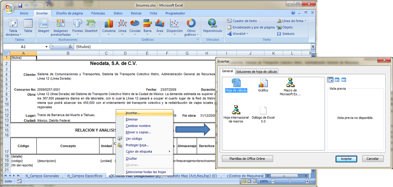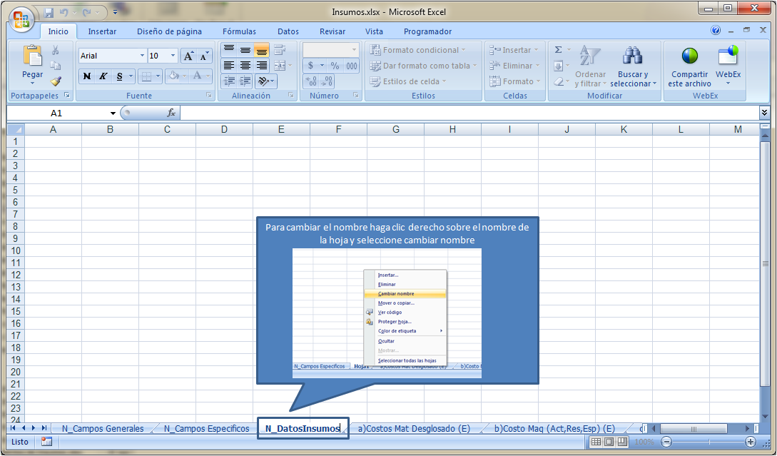 Para ello se debe crear una nueva hoja en nuestro formato con el nombre N_DatosInsumos. Cuando en un reporte existe una hoja con el prefijo "N_" el sistema lo interpreta como una hoja auxiliar donde se almacena información que no debe ser eliminada.
