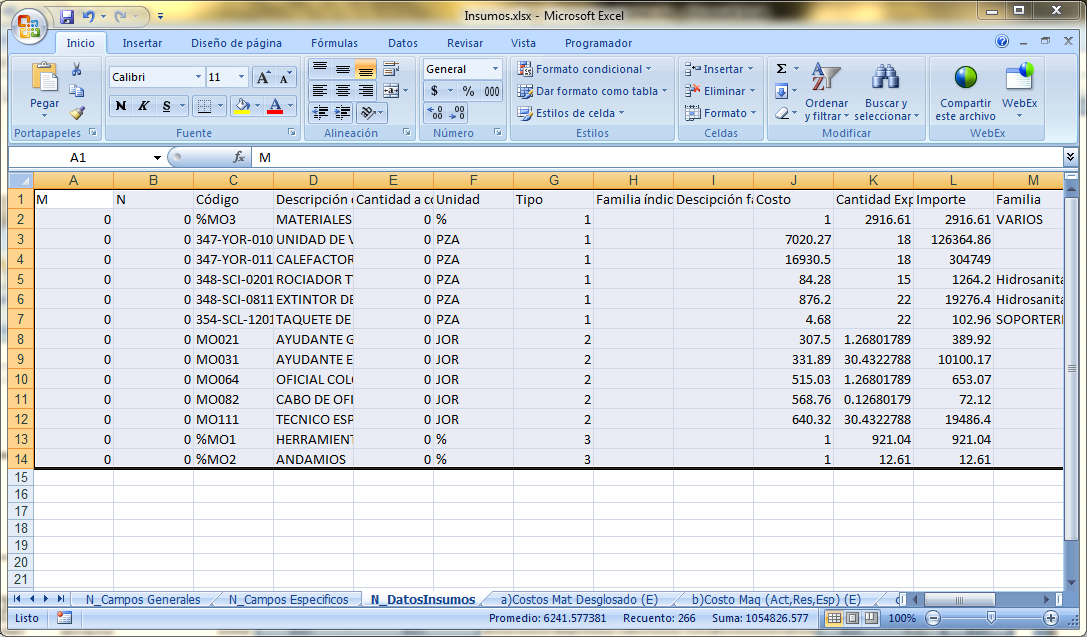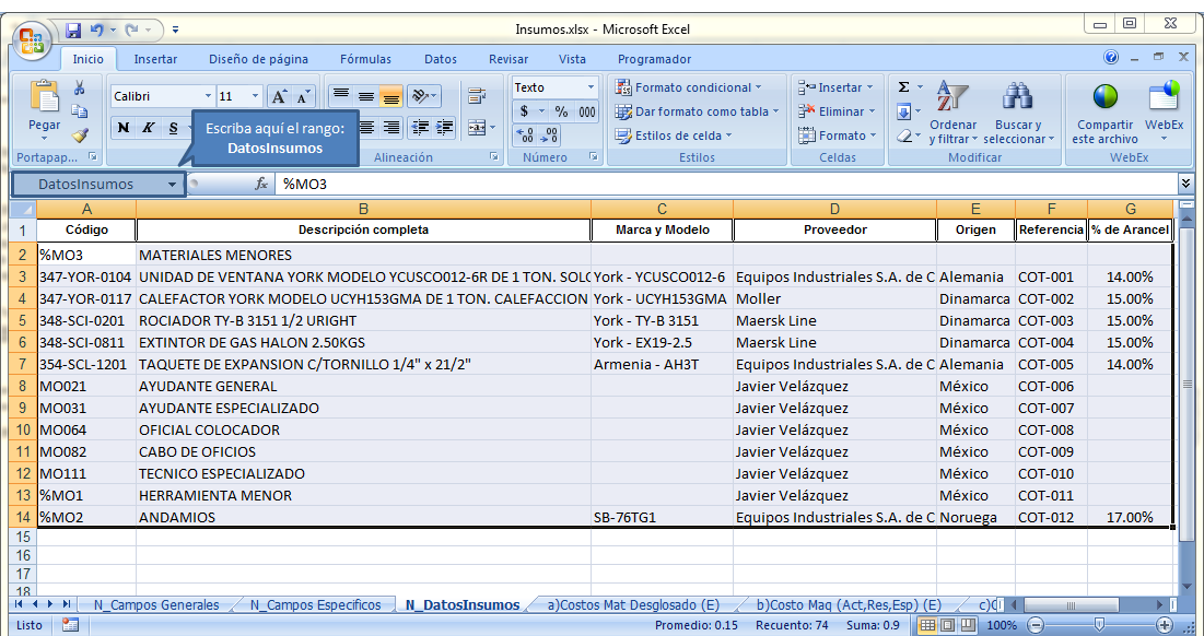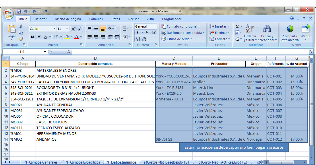 Una vez copiada la información se pega en la hoja de N_DatosInsumos.