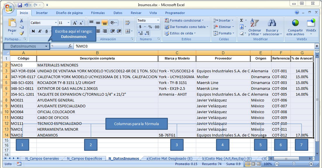 % de Arancel: =SI(A20<=0, " ", BUSCARV(A20,DatosInsumos,7,FALSO))