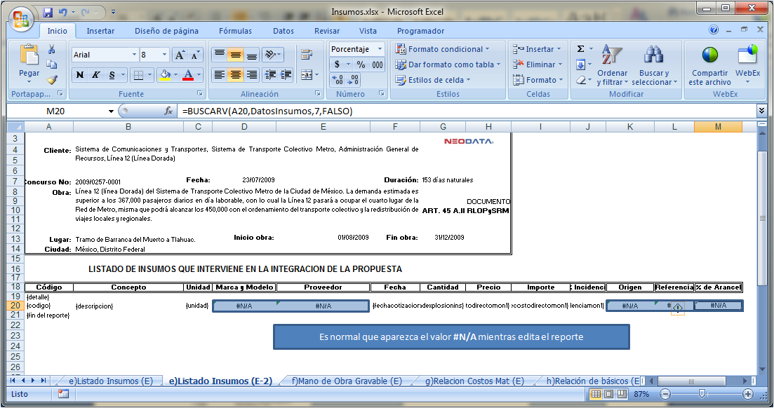 Para este ejemplo se utilizará el formato DE-3 que PEMEX Refinación solicitó para una licitación. El reporte a utilizar es el listado de insumos: