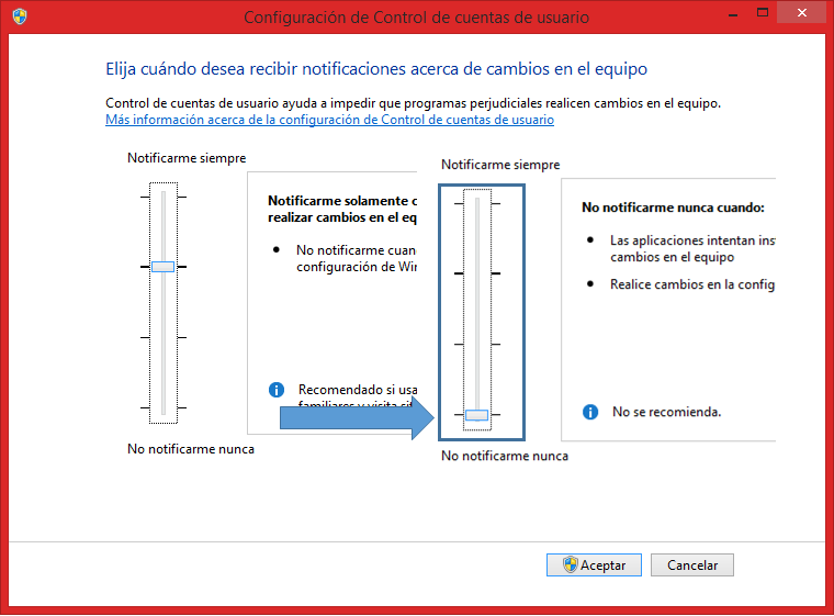 4. De forma predeterminada estará en el tercero o cuarto nivel (de abajo hacia arriba), debe colocar el marcador en la opción "No notificarme nunca").